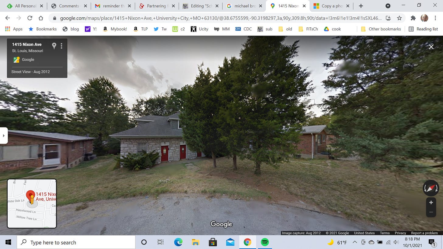 University City is not a crime-ridden, godforsaken ghetto. St. Louis has some of those, particularly in the city proper. But U. City is part of Saint Louis County, which surrounds the city to the North, South, and West (the Mississippi River sits to the East), and many of those suburbs are affluent. When I visited U. City a few years ago, it had sections that were gentrified, with many trendy restaurants. My old street was quiet and peaceful.