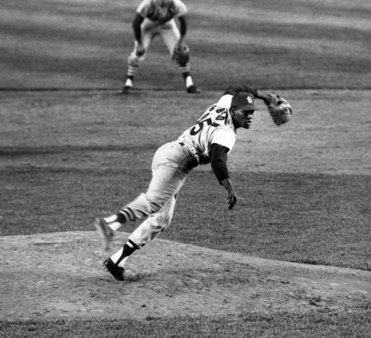 Game action of St. Louis Cardinals pitcher Bob Gibson - BL-6256-88 (Fred Roe/National Baseball Hall of Fame Library)
